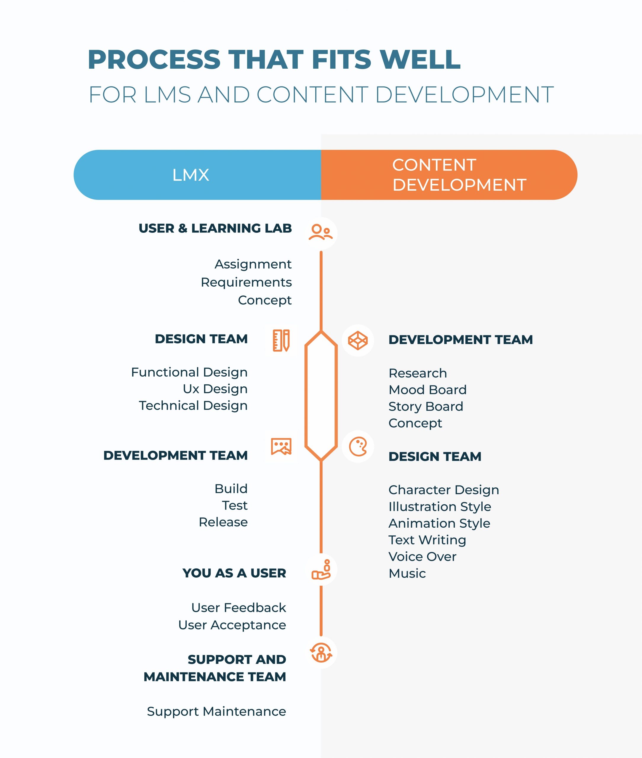 Enterprises collaborate with many specialized vendors. However, if one vendor could cover many areas, it could improve the overall efficiency of your organization.. Apart from LMS implementation and e-learning content creation, you may benefit from our full software development and design, as well as support services or technical consultancy.