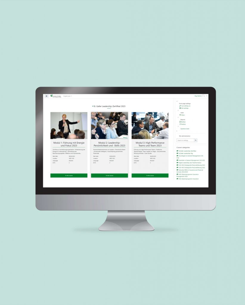 We developed and implemented a Moodle platform for the University of St. Gallen, with each department having its own instance and adapted design. We also integrated Moodle with Full Fabric LMS, enabling lectures to be recorded and uploaded for online programs and the organization of lectures.